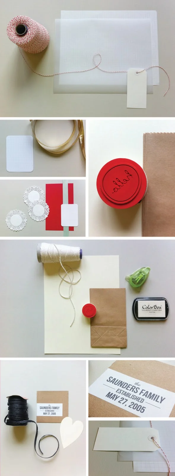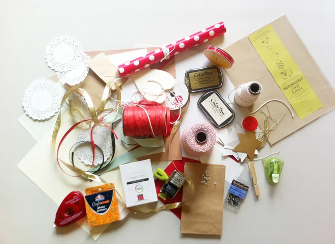 Lots of paper, ribbon and assorted notions round out my findings: red and white bakers twine, some plain white gift tags, vellum, graph paper (love that!), all kinds of ribbon (red, gold, mint), black raffia, simple card stock (in white, cream and red), kitchen string, and little kraft paper bags.