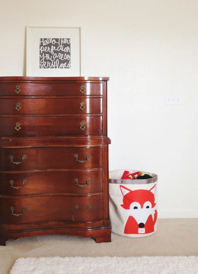 Ben's "big boy room" has been a bit of a work-in-progress over the last month. We moved him into his toddler bed two weeks ago on a night when he was running a fever and crying in the hallway pointing to the nursery saying "Ben's room other way."